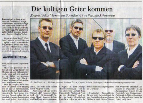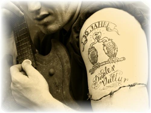 DUPLEX VULTUR flattert immer mal wieder los. Die schlecht gestochene "30" bei dem jungen Mann ist auch nicht mehr aktuell. Der nächste Gig startet vermutlich 2018, zum 40-jährigen Jubiläum. Aber vielleicht auch früher...weiß der Geier. Wenn es dann losgeht, spricht es sich schnell rum - und der "Treffpunkt" Wolmersdorf wird wieder ordentlich gerockt.